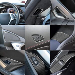 The complete interior trim kit is fabricated using real carbon fiber – a material known for its strength, lightweight properties, and sleek appearance. The kit covers a wide range of interior components, ensuring that every corner of your Corvette’s interior emanates luxury.
