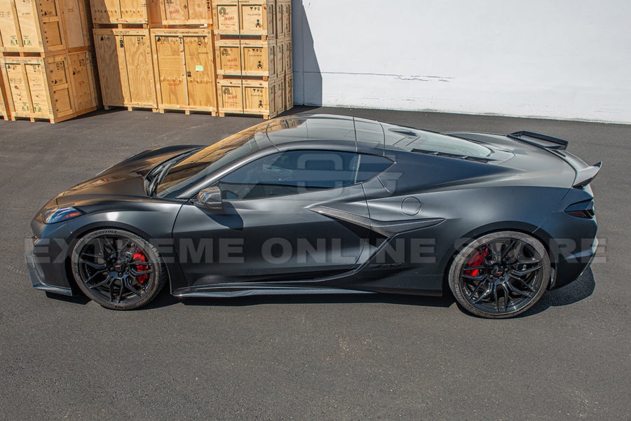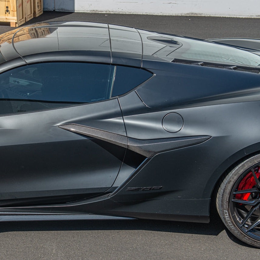 The package includes the Corvette C8 Z06 Carbon Fiber Side Fender Vent Door Garnish. This provides a complete and ready-to-install solution for enhancing the exterior aesthetics of the vehicle. These side fender vent door garnishes are specifically designed for the Z06 and E-Ray models and are not compatible with the Stingray and Z51 models. This ensures that the garnishes are tailored to the unique design and performance characteristics of the specified Corvette variants.