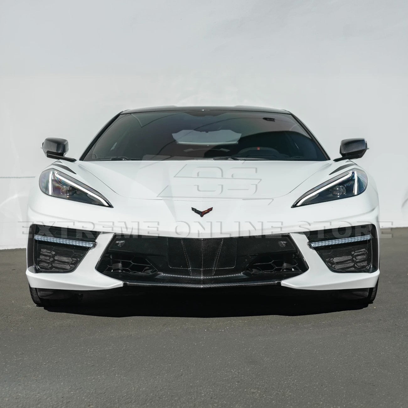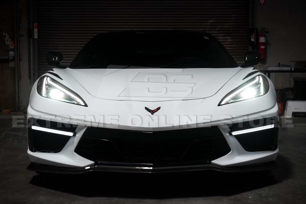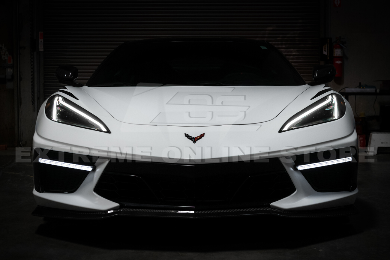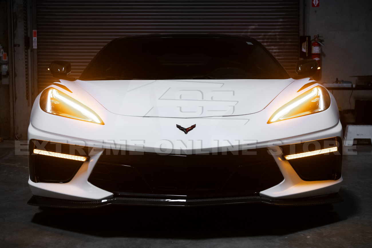 Fits all 2020–Present Chevrolet Corvette C8 Base Models. Features GM factory style with a carbon fiber finish. Includes sequential LED DRL light bar bezel insert for a sleek, modern front-end upgrade.