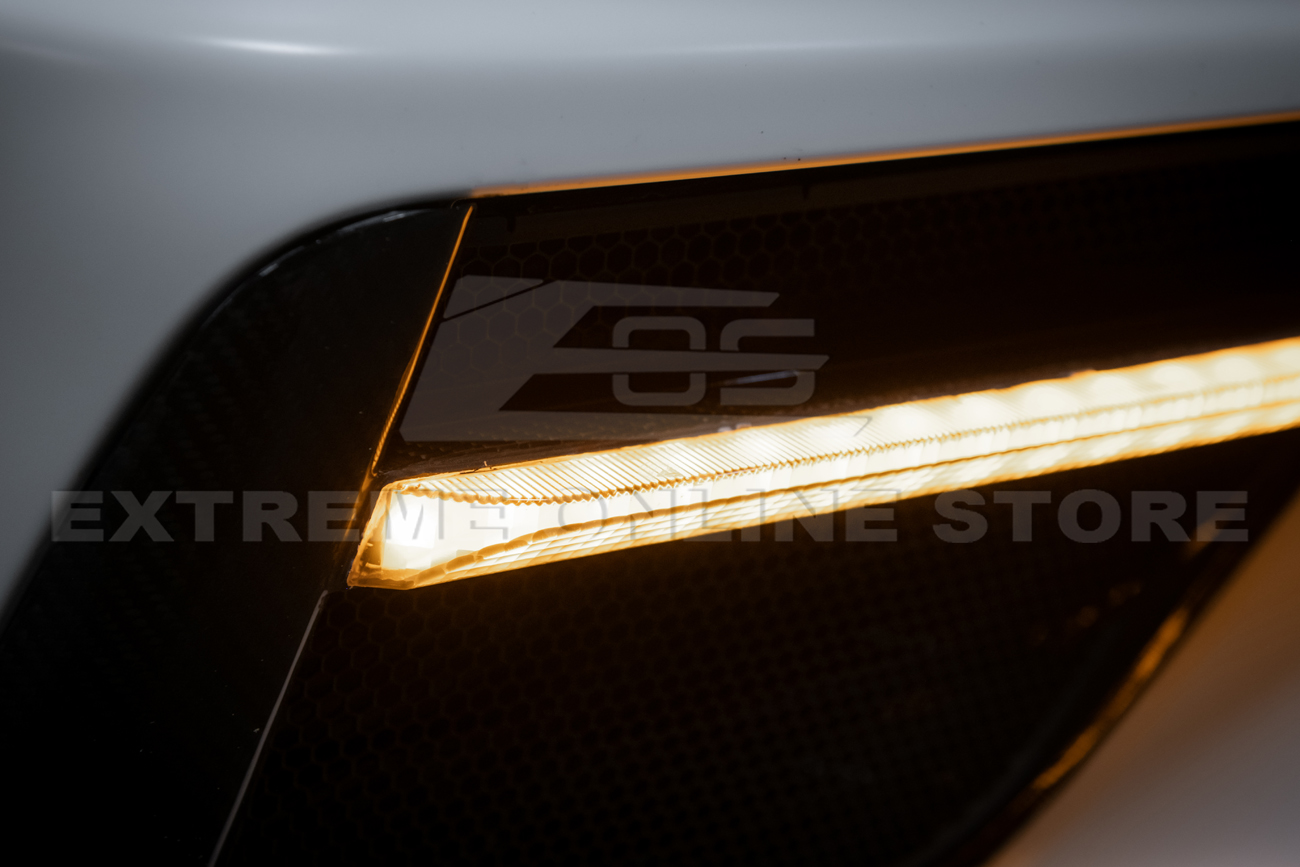 Transform the front end of your C8 Corvette Stingray with these Carbon Fiber LED Daytime Running Light (DRL) Grille Bezel Inserts — the ultimate fusion of performance styling and practical lighting.