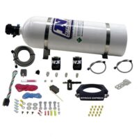 The Nitrous Express C8 plate systems feature Spraybarless technology for the ultimate in atomization and distribution. The billet plate bolts between the throttle body and intake making installation quick and easy. The solenoids are integrated into the plate for a super clean look and easy install. A direct-plug-in Fuel Line Adapter is provided to simplify installation (no need to cut your factory fuel lines). This system includes a TPS Autolearn switch so the nitrous only activates at wide open throttle and automatically turns off when you let your foot off the accelerator. The system includes jetting for 35, 50, 75, 100, 125, 150, 200, 250, and 300 horsepower. Systems include a stainless braided N2O line, master arming switch, relay, relay harness and all necessary hardware to complete the installation. Systems ordered with a nitrous bottle include the new billet aluminum Lightning 45 bottle valve and stainless bottle brackets.