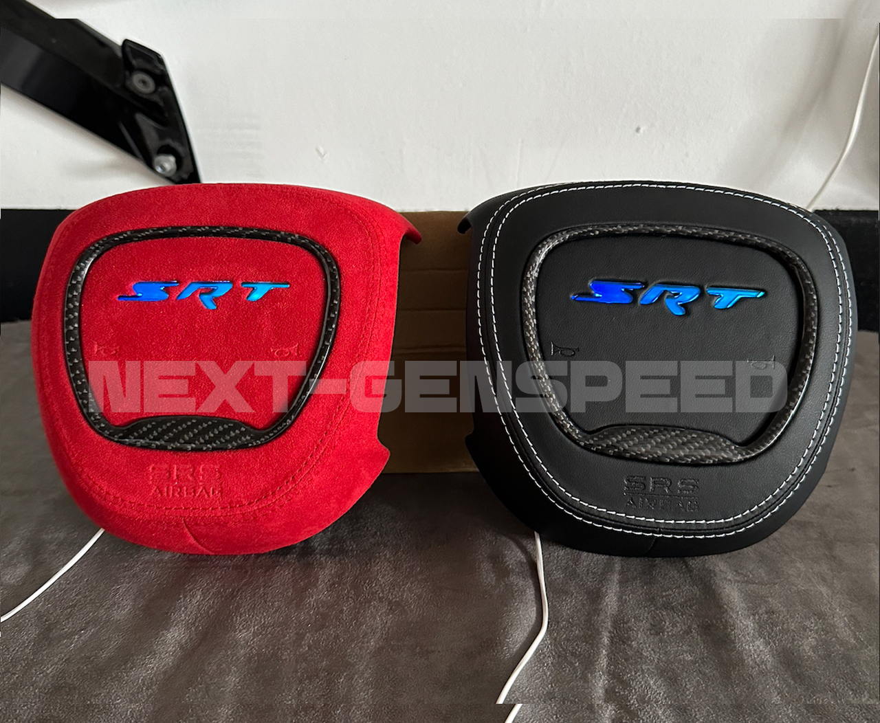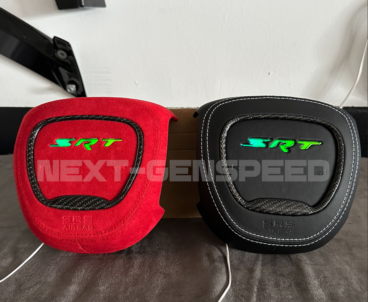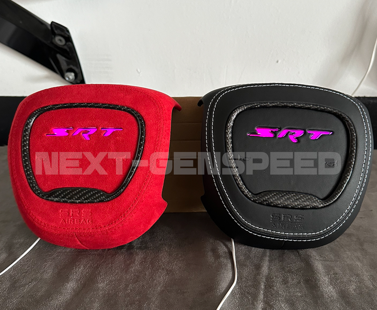 NEW Custom RGB LED Customized Steering Airbag Cover Replacement for any 2015+ Charger/Challenger/Durango SRT Center Airbag Cover Kit. Made to order with Real Carbon Fiber and Alcantara/Leather Material. Your choice of colors on the Stitching. Made to order – Current build time is about 3-4 weeks